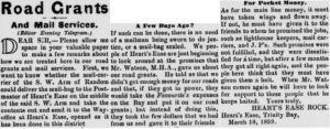 Dear Sir, – Please allow me space in your valuable paper to make a few remarks about how we are treated here in our road grants and mail services. First, we want to know whether the mail-carrier of the S.W. Arm of Random could deliver the mail-bag to the Post-master of Heart’s Ease on the middle of the S.W. Arm and take the contents out and send it to the Way-office at Heart’s Ease, opened as it has been done in this district.