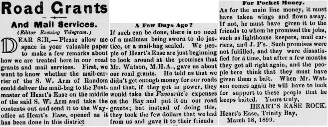 If such can be done, there is no need of a mailman being sworn to do justice, or a mail-bag sealed. We people of Heart’s Ease are just beginning to look around at the promises that Mr. Watson, M.H.A. gave us about our road grants. He told us that we didn’t get enough money for our roads and that, if they got in power, they would take the Favourite’s expenses on the Bay and put it on our road grants; but instead of doing this, they took the few dollars that we had from us and gave it to their friends.