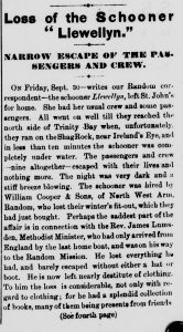 On Friday, Sept. 30 – writes our Random correspondent – the schooner Llewellyn, left St. John’s for home. She had her usual crew and some passengers. All went on well till they reached the north side of Trinity Bay when, unfortunately, they ran on the Shag Rock, near Ireland’s Eye, and in less than ten minutes the schooner was completely under water. The passengers and crew – nine altogether – escaped with their lives and nothing more. The night was very dark and a stiff breeze blowing. The schooner was hired by William Cooper & Sons, of North West Arm, Random Island, who lost their winter’s fit out, which they had just bought. Perhaps the saddest part of the affair is in connection with the Rev. James Lumsden, Methodist Minister, who had only arrived from England by the last home boat, and was on his way to the Random Mission. He lost everything he had, and barely escaped