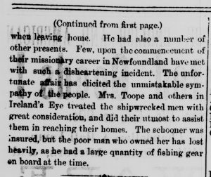 without either a hat or boot. He is now left nearly destitute of clothing. To him the loss is considerable, not only with regard to clothing; for he had a splendid collection of books, many of them being presents from friends when leaving home. He had also a number of other presents. Few upon the commencement of their missionary career in Newfoundland have met with such a disheartening incident. The unfortunate affair has elicited the unmistakable sympathy of the people. Mrs. Toope and others in Ireland’s Eye treated the shipwrecked men with great consideration, and did their utmost to assist them in reaching their homes. The schooner was insured, but the poor man who owned her has lost heavily, as he had a large quantity of fishing gear on board at the time.