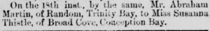 On the 18th inst. [November], by the same [Rev. T.H. James], Mr. Abraham Martin, of Random, Trinity Bay, to Miss Susanna Thistle, of Broad Cove, Conception Bay.