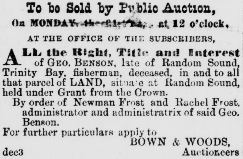 To Be Sold by Public Auction, On MONDAY, the 31 Dec, at 12 o’clock, AT THE OFFICE OF THE SUBSCRIBERS, ALL THE Right, Title and Interest of Geo. Benson, late of Random Sound, Trinity Bay, fisherman, deceased, in and to all that parcel of LAND, situated at Random Sound, held under Grant from the Grown.
