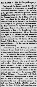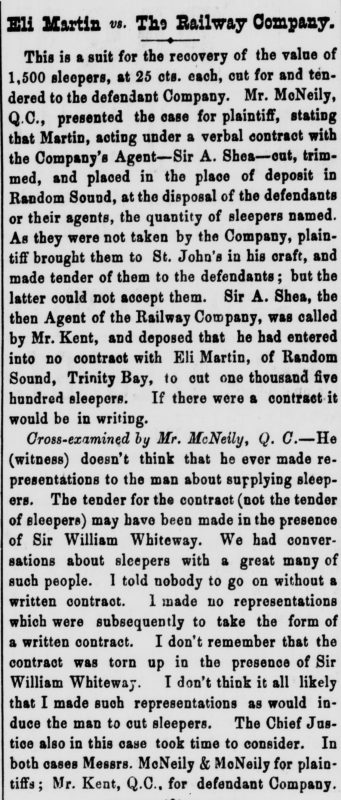 This is a suit for the recovery of the value of 1,500 sleepers, at 25 cents, each, cut for and tendered to the defendant Company. Mr. McNeily, Q.C., presented the case for plaintiff, stating that Martin, acting under a verbal contract with the Company’s Agent—Sir A. Shea—cut, trimmed, and placed in the place of deposit in Random Sound, at the disposal of the defendants or their agents, the quantity of sleepers named. As they were not taken by the Company, plaintiff brought them to St. John’s in his craft, and made tender of them to the defendants; but the latter could not accept them. Sir A. Shea, the then Agent of the Railway Company, was called by Mr. Kent, and deposed that he had entered into no contract with Eli Martin, of Random Sound, Trinity Bay, to cut one thousand five hundred sleepers. If there were a contract it would be in writing. Cross-examined by Mr. McNeily, Q. G.—He (witness) doesn’t think that he ever made representations to the man about supplying sleepers. The tender for the contract (not the tender of sleepers) may have been made in the presence of Sir William Whiteway. We had conversations about sleepers with a great many of such people. I told nobody to go on without a written contract. I made no representations which were subsequently to take the form of a written contract. I don’t remember that the contract was torn up in the presence of Sir William Whiteway. I don’t think it all likely that I made such representations as would induce the man to cut sleepers. The Chief Justice also in this case took time to consider. In both cases Messrs. McNeily & McNeily for plaintiffs; Mr. Kent, Q.C., for defendant Company.