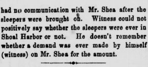 To the Court—lt was after the 10th of April, 1882, that I wrote the letter to Eli Martin respecting Mr. Shea’s direction, to take the sleepers from their place on the bank; but witness could not fix the time (whether spring or fall) that they were brought on here. He (witness) had no communication with Mr. Shea after the sleepers were brought on. Witness could not positively say whether the sleepers were ever in Shoal Harbor or not. He doesn’t remember whether s demand was ever made by himself (witness) on Mr. Shea for the amount.