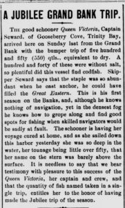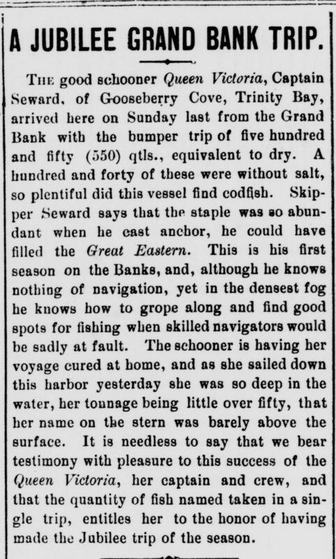 The good schooner Queen Victoria, Captain Seward, of Gooseberry Cove, Trinity Bay, arrived here on Sunday last from the Grand Bank with the bumper trip of five hundred and fifty (550) qtls., equivalent to dry. A hundred and forty of these were without salt, so plentiful did this vessel find codfish. Skipper Seward says that the staple was so abundant when he cast anchor, he could have filled the Great Eastern. This is his first season on the Banks, and, although he knows nothing of navigation, yet in the densest fog be knows how to grope along and find good spots for fishing when skilled navigators would be sadly at fault. The schooner is having her voyage cured at home, and as she sailed down this harbor yesterday she was so deep in the water, her tonnage being little over fifty, that her name on the stern was barely above the surface. It is needless to say that we bear testimony with pleasure to this success of the Queen Victoria, her captain and crew, and that the quantity of fish named taken in a single trip, entitles her to the honor of having made the Jubilee trip of the season.