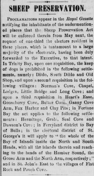 Proclamations appear in the Royal Gazette notifying the inhabitants of the undermentioned places that the Sheep Preservation Act will be enforced therein from May next, the request of one-third the electors resident in these places, which is tantamount to a large majority of the electorate, having been duly forwarded to the Executive, to that intent. In Trinity Bay, upon one requisition, the keep of dogs is prohibited in the following settlements, namely: Dildo, South Dildo and Old Shop, and upon a second requisition iv the following villages: Norman’s Cove, Chapel, Lodges, Little Bridge and Long Cove; and upon a third requisition in Heart’s Ease, Gooseberry Cove, Butter Cove, Ganny Cove Arm, Fox Harbor and Clay Pits; in Fortune Bay the act applies to the following settlements: Hermitage, Grale, Seal Cove and Dawson’s Cove; in Ferryland district to Bay of Bulls; in the electoral district of St. George’s it wi!l apply to “the whole of the Bay of Islands inside the North and South Heads, with all the islands therein and reaching to the heads of the Humber Sound, the Goose Arm and the North Arm, respectively;” and in St. John’s East to the villages of Flat Rock and Pouch Cove.