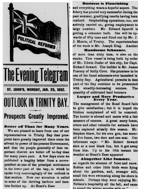 A Smart, New Schooner. – In a smart new schooner, the Nonpariel, R. Seward, master built the past winter in Trinity Bay, Mr. W. Flynn of Heart’s Ease has arrived here to make arrangements for his Spring’s business. Miss Sarah Seward is also a passenger hither.