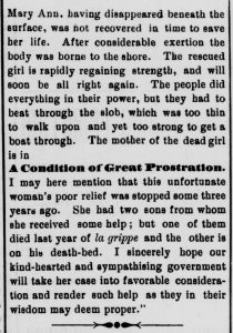 before the vital spark fled, but poor little Mary Ann, having disappeared beneath the surface, was not recovered in time to save her life. After considerable exertion the body was borne to the shore. The rescued girl is rapidly regaining strength, and will soon be all right again. The people did everything in their power, but they had to beat through the slob, which was too thin to walk upon and yet too strong to get a boat through. The mother of the dead girl is in a condition of great prostration. I may here mention that this unfortunate woman’s poor relief was stopped some three years ago. She had two sons from whom she received some help; but one of them died last year of la grippe and the other is on his death-bed. I sincerely hope our kind-hearted and sympathising government will take her case into favorable consideration and render such help as they in their wisdom may deem proper.”