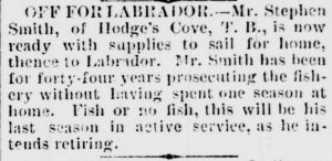 OFF FOR LABRADOR.—Mr. Stephen Smith, of Hodge’s Cove, T.B., is now ready with supplies to sail for home, thence to Labrador. Mr. Smith has been for forty-four years prosecuting the fishery without having spent one season at home. Fish or no fish, this will be his last season in active service, as he intends retiring.
