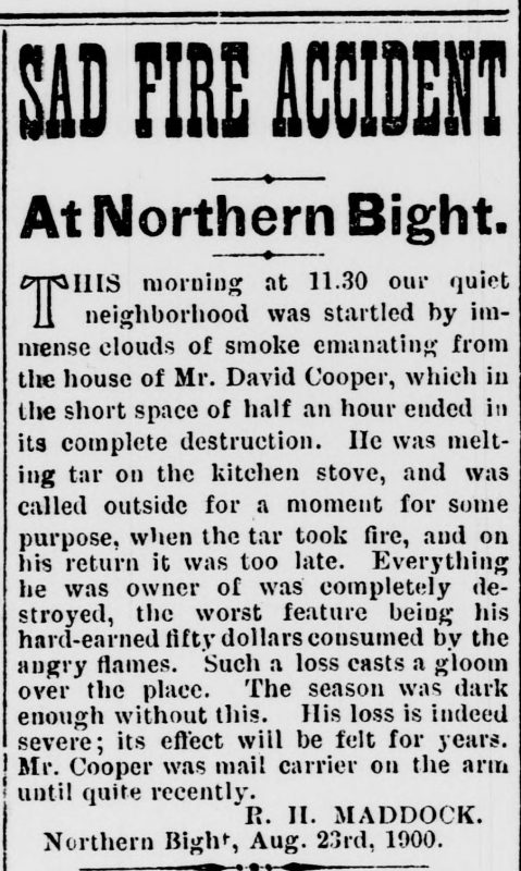 This morning at 11:30 our quiet neighborhood was startled by immense clouds of smoke emanating from the house of Mr. David Cooper, which in the short space of half an hour ended in its complete destruction. He was melting tar on the kitchen stove, and was called outside for a moment for some purpose, when the tar took fire, and on his return it was too late. Everything he was owner of was completely destroyed, the worst feature being his hard-earned fifty dollars consumed by the angry flames. Such a loss casts a gloom over the place. The season was dark enough without this. His loss is indeed severe; its effect will be felt for years. Mr. Cooper was mail carried on the arm until quite recently.