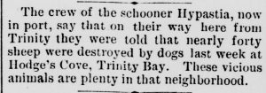 The crew of the schooner Hypastia, now in port, say that on their way here from Trinity they were told that nearly forty sheep were destroyed by dogs last week at Hodge’s Cove, Trinity Bay. These vicious animal are plenty in that neighborhood.
