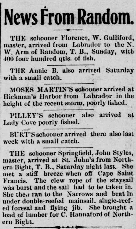 The schooner Springfield, John Styles, master, arrived at St. John’s from Northern Bight, T.B., Saturday night last. She met a stiff breeze when off Cape Saint Francis. The clew rope of the staysail was burst and the sail had to be taken in. She then ran to the Narrows and beat in under double-reefed mainsail, single-reefed foresal and flying jib. She brought a load of lumber for C. Hannaford of Northern Bight.