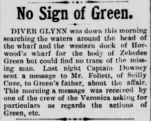 THIS morning at breakfast time Captain John Downey, of the schooner Veronica, of Scilly Cove, T.B., lying at Horwood’s lower premises, formerly Tasker & Co.’s, reported to the police that Zebedee Green, a passenger on the Veronica from Scilly Cove, T.B., was missing, Green is a young man of twenty-two years of age and came on the Veronica to sell his fish which came also on the schooner, part of which he sold to Mr. Fearn and the remainder is on board the craft. He was married Saturday week, his father and mother are living. Last night he went on board about midnight and went to bed. He slept with one of the crew named Peter Tucker who didn’t miss him until about 4 o’clock this morning. None of the crew heard him getting up out of bed. He took a pair of boots belonging to one of the crew, leaving his own behind ; he took no coat or vest. Where he could have gone in such a condition is a mystery. Thinking that he may have fallen overboard the captain and crew of the schooner got jiggers and began groping in the cove where the schooner is lying.