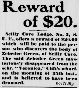 Scilly Cove Lodge, No. 2, S.U.F. offers a reward of $20.00 which will be paid to the person who discovers the body of Zebedee Green, of Scilly Cove. The said Zebedee Green mysteriously disappeared from the schr. “Veronica,” Cliff’s wharf, on the morning of 25th inst., and is believed to have been drowned.