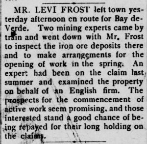 Mr. Levi Frost left town yesterday afternoon en route for Bay de Verde. Two mining experts came by train and went down with Mr. Frost to inspect the iron ore deposits there and to make arrangements for the opening of work in the