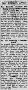 Two Sewards, Johnston and Strong Charged with Stealing from the Reif-Nfld. Co. Head Constable Dawe arrived last evening by the Bruce express from Clarenville in charge of four prisoners — James Johnston, Nicholas Strong, Bartholomew Seward and Richard Seward. These men are charged with the larceny of several articles at different periods. Some time ago the Reid-Nfld. Co. made a complaint to the Inspector-General that some boxes had been missing from their station at Clarenville. Head Constable Dawe was dispatched to look up the thieves. After some “cute” moves being made by him On the Detective “Checker-board,” he arrested James Johnson, who was in the employ of the company. Johnson admitted his guilt; then the “Head” arrested Richard Seward. The boxes were stolen, it is said, about Christmas last from the railway siding; one of them contained liquor and the other combs (used by women to adorn their hair), a number of which were distributed around the settlement by Johnson to his friends. Nicholas Strong was the next prisoner arrested. He was charged with stealing a box containing liquor which was missed about a year ago, and which was hidden under a bridge. Bartholomew Seward is charged with opening a box of liquor in the freight shed with Johnson. Head Constable Dawe locked two of them in the bedroom at the railway station at Clarenville, and kept guard over them all night. They will be brought up before Judge Flannery this afternoon for trial.