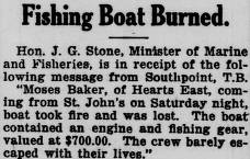 Hon. J. G. Stone, Minister of Marine and Fisheries, is in receipt of the following message from Southpoint, T.B. “Moses Baker, of Hearts East, coming from St John’s on Saturday night, boat took fire and was lost The boat contained an engine and fishing gear, valued at $700.00. The crew barely escaped with their lives.”