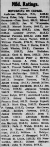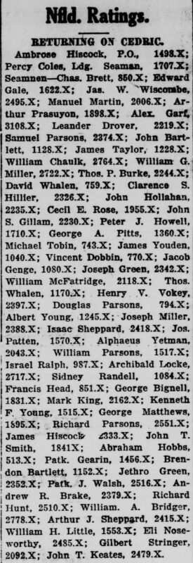 Ambrose Hiscock, P.O., 1498.X; Percy Coles, Ldg. Seaman, 1707.X; Seamnen—Chas. Brett, 850.X; Edward Gale, 1622.X; Jas. W. Wiscombe, 2495.X; Manuel Martin, 2006.X; Arthur Prasuyon, 1898.X; Alex. Garf, 3108.X; Leander Drover, 2219.X; Samuel Parsons, 2374.X; John Bartlett, 1128.X; James Taylor, 1228.X; William Chaulk, 2764.X; William G. Miller, 2722.X; Thos. P. Burke, 2244.X; David Whalen, 759.X; Clarence S. Hillier, 2326.X; John Hollahan, 2235.X; Cecil E. Rose, 1955.X; John S. Gillam, 2230.X; Peter J. Howell, 1710.X; George A. Pitts, 1360.X; Michael Tobin, 743.X; James Youden, 1040.X; Vincent Dobbin, 770.X; Jacob Genge, 1080.X; Joseph Green, 2342.X; William McFatridge, 2118.X; Thos. Whalen, 1170.X; Henry V. Vokey, 2397.X; Douglas Parsons, 794.X; Albert Young, 1245.X; Joseph Miller, 2388.X; Isaac Sheppard, 2418.X; Jos. Patten, 1570.X; Alphaeus Yetman, 2043.X; William Parsons, 1517.X; Israel Ralph, 987.X; Archibald Locke, 2717.X; Sidney Randell, 1084.X; Francis Head, 851.X; George Bignell, 1831.X; Mark King, 2162.X; Kenneth F. Young, 1515.X; George Matthews, 1895.X; Richard Parsons, 2551.X; James Hiscock, 2333.X; John T. Smith, 1841.X; Abraham Hobbs, 513.X; Patk. Gearin, 1456.X; Brendon Bartlett, 1152.X; Jethro Green, 2352.X; Patk. J. Walsh, 2516.X; Andrew R. Brake, 2379.X; Richard Hunt, 2510.X; William A. Bridger, 2778.X; Arthur J. Sheppard, 2415.X; William H. Little, 1553.X; Eli Noseworthy, 2485.X; Gilbert Stringer, 2092.X; John T. Keates, 2479.X.
