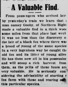 From passengers who arrived here by yesterday’s train we learn that a man named Gooby, of Northern Bight, mad a valuable find in a thick wood some miles from that place last week. It was no less than the discovery of the lair of a black fox where there was a brood of young of the same species. In a very ingenious way he caught the old fox and its litter of young alive. He has them now all in his possession and will scoop a rich harvest from them, as the pelts of these foxes are very valuable. He is seriously considering the advisability of starting a fox farm with these and rearing only this particular species.