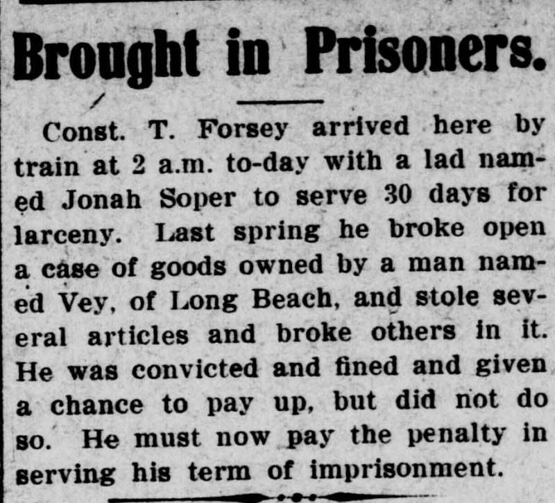 Brought in Prisoners. – Const. T. Forsey arrived here by train at 2 a.m. to-day with a lad named Jonah Soper to serve 30 days for larceny. Last spring he broke open a case of goods owned by a man named Vey, of Long Beach, and stole several articles and broke others in it. He was convicted and fined a given a chance to pay up, but did not do so. He must now pay the penalty in serving his term of imprisonment.