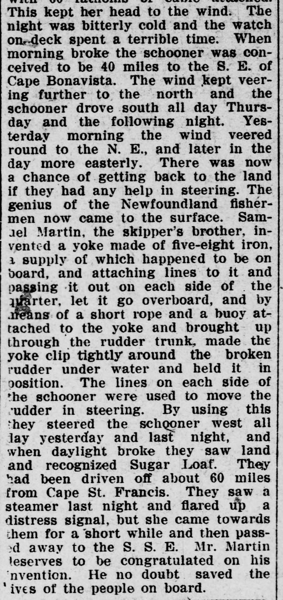 the bow with 60 fathoms of cable attached. This kept her head to the wind. The night was bitterly cold and the watch on-deck spent a terrible time. When morning broke the schooner was conceived to be 40 miles to the S. E. of Cape Bonavista. The wind kept veering further to the north and the schooner drove south all day Thursday and the following night. Yesterday morning the wind veered round to the N. E., and later in the day more easterly. There was now a chance of getting back to the land if they had any help in steering. The genius of the Newfoundland fishermen now came to the surface. Samuel Martin, the skipper’s brother, invented a yoke made of five-eight iron, a supply of which happened to be on board, and attaching lines to it and passing it out on each side of the quarter, let it go overboard, and by means of a short rope and a buoy attached to the yoke and brought up through the rudder trunk, made the yoke clip tightly around the broken rudder under water and held it in position. The lines on each side of the schooner were used to move the udder in steering. By using this they steered the schooner west all day yesterday and last night, and when daylight broke they saw land and recognized Sugar Loaf. They had been driven off about 60 miles from Cape St. Francis. They saw a steamer last night and flared up a distress signal, but she came towards them for a short while and then passed away to the S. S. E. Mr. Martin deserves to be congratulated on his invention. He no doubt saved the lives of the people on board.