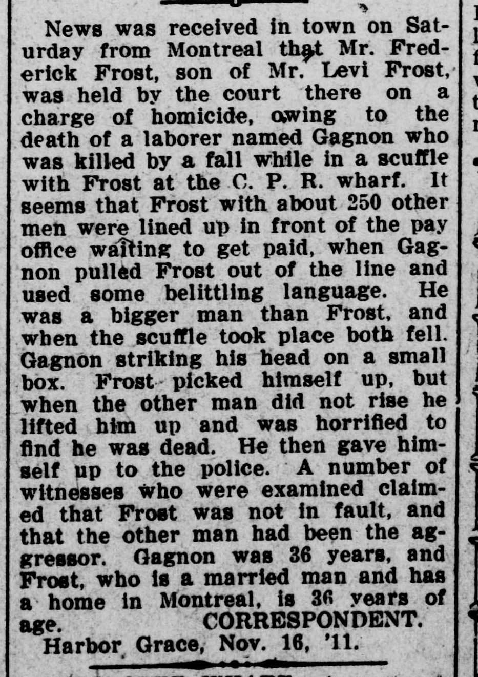 News was received in town on Saturday from Montreal that Mr. Frederick Frost, son of Mr. Levi Frost, was held by the court there on a charge of homicide, owing to the death of a laborer named Gagnon who was killed by a fall while in a scuffle with Frost at the C. P. R. wharf. It seems that Frost with about 250 other men were lined up in front of the pay office waiting to get paid, when Gagnon pulled Frost out of the line and used some belittling language. He was a bigger man than Frost, and when the scuffle took place both fell. Gagnon striking his head on a small box. Frost picked himself up, but when the other man did not rise he lifted him up and was horrified to find that he was dead. He then gave himself up to the police. A number of witnesses who were examined claimed that Frost was not in fault, and that the other man had been the aggressor. Gagnon was 36 years, and Frost, who is a married man and has a home in Montreal, is 36 years of age.December 2, 1911