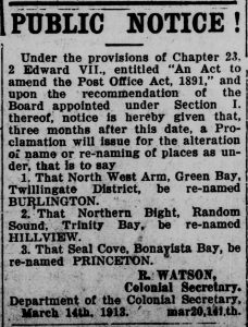 - That Seal Cove, Bonavista Bay, be re-named PRINCETON.