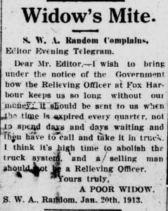 Dear Mr. Editor, — I wish to bring under the notice of the Government how the Relieving Officer at Fox Harbour keeps us so long without our money; it should be sent to us when the time is expired every quarter, not to spend days and days waiting and then have to call and take it in truck. I think it’s high time to abolish the truck system, and a selling man should not be a Relieving Officer.