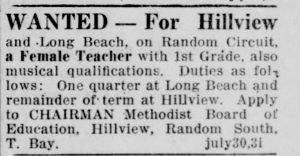 Wanted – for Hillview and Long Beach on Random Circuit, a Female Teacher with 1st Grade, also musical qualifications. Duties as follows: one quarter at Long Beach and remainder of term at Hillview. Apply to Chairman Methodists Board of Education, Hillview, Random South, T. Bay.