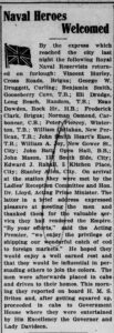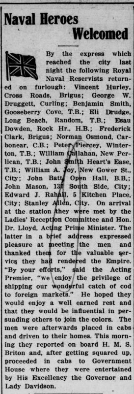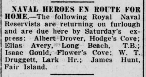 The Following Royal Naval Reservists are returning on furlough and are due here by Saturday’s express: Albert Drover, Hodge’s Cove; Elias Avery, Long Beach, T.B.; Isaac Gould, Flower’s Cove; W.T. Druggett, Lark Hr.; James Hunt, Fair Island.