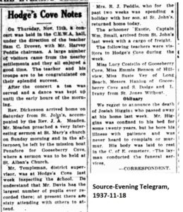 Mr. Templeman, district supervisor, was at Hodge’s Cove last week inspecting the school. We understand that Mr. Davis has the largest number of pupils ever recorded there; at present there are sixty attending with others to attend.