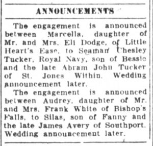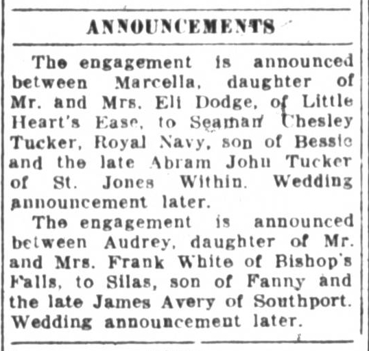 The engagement is announced between Marcella, daughter of Mr. and Mrs. Eli Dodge, of Little Heart’s Ease, to Seaman Chesley Tucker, Royal Navy, son of Bessie and the late Abram John Tucker of St. Jones Within. Wedding announcement later.