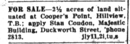 2 ½ acres of land situated at Cooper’s Point, Hillview, T.B.; apply Stan Condon, Majestic Building, Duckworth Street, ‘phone 2813.