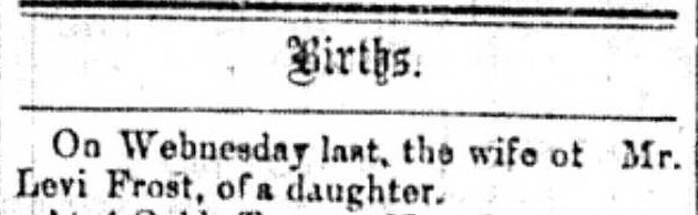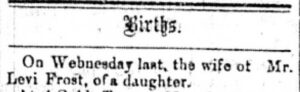 On Wednesday last, the wife of Mr. Levi Frost, of a daughter [Mary Elizabeth].