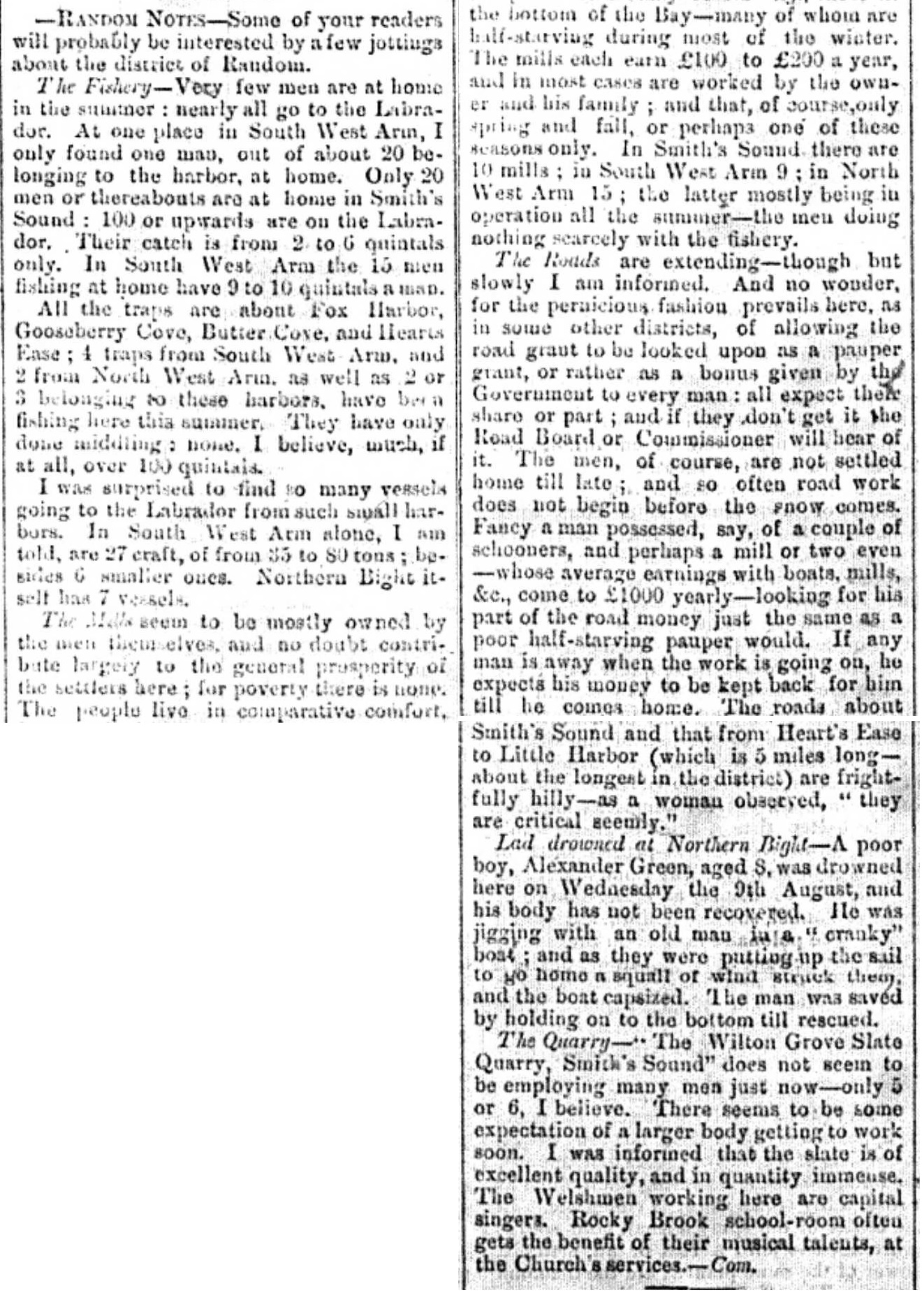 The Quarry – “The Wilton Grove Slate Quarry, Smith’s Sound” does not seem to be employing many men just now – only 5 or 6, I believe. There seems to be some expectation of a larger body getting to work soon. I was informed that the slate is of excellent quality, and in quantity immense. The Welshmen working there are capital singers. Rocky Brook school-room often gets the benefit of their musical talents, at the Church’s services. – Com.
