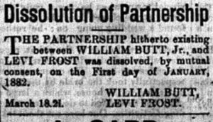 The partnership hithero existing between William Butt, Jr., and Levi Frost was dissolved, by mutual consent, on the First day of January, 1882.