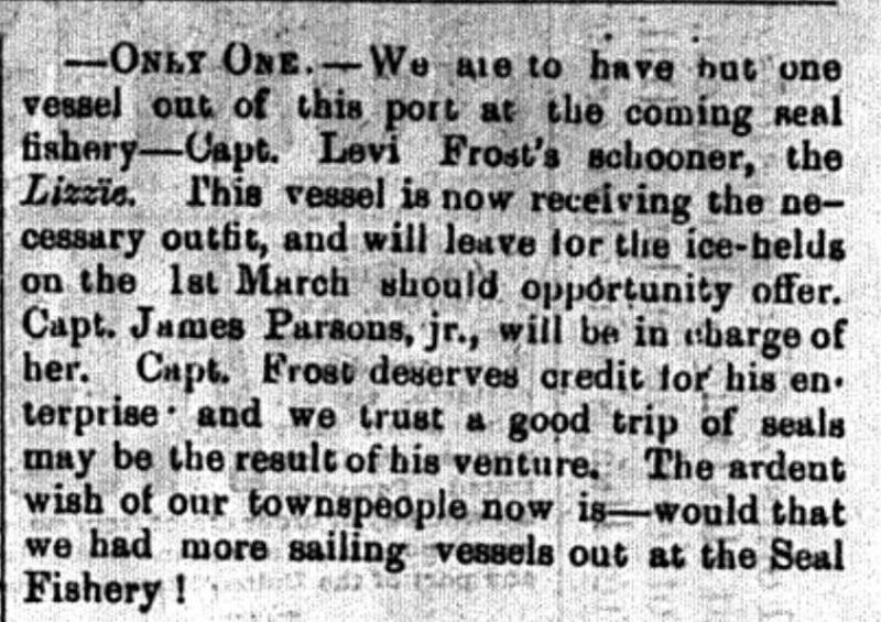 —ONLY ONE.—We are to have but one vessel out of this port at the coming seal fishery—Capt. Levi Frost’s schooner, the Lizzie. This vessel is now receiving the necessary outfit, and will leave for the ice-helds on the 1st March should opportunity offer. Capt. James Parsons, jr., will be in charge of her. Capt. Frost deserves credit for his enterprise and we trust a good trip of seals may be the result of his venture. The ardent wish of our townspeople now is—would that we had more sailing vessels out at the Seal Fishery!