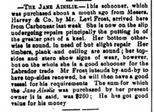 —THE JANE AINSLIE.—This schooner, which was purchased about a month ago from Messrs. Harvey & Co. by Mr. Levi Frost, arrived here from Carbonear last week. She is now on the slip undergoing repairs principally the putting in of the greater part of a keel. Her bottom otherwise is sound, in need of but slight repair. Her timbers, plank and ceiling are sound; her top-sides and stern show signs of wear, however, but on the whole she is a good schooner for the Labrador trade. Mr. Frost intends by-and-by to have top-sides renewed, he will then have a good vessel for his requirements. The sum for which the Jane Ainslie was purchased by her present owner it is said, was $260; He has got good value for his money._______________________________