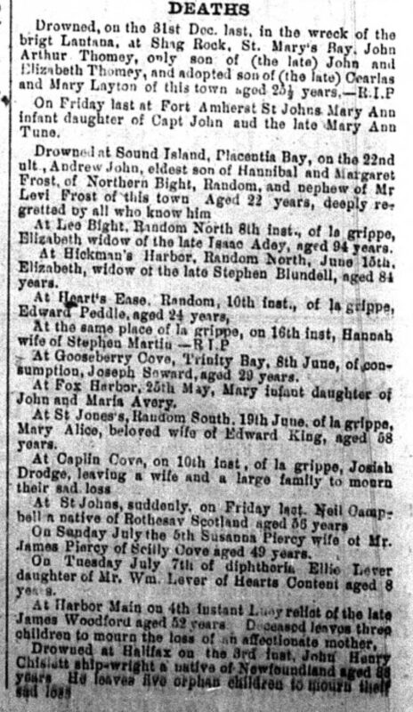 Drowned, on the 31st Dec. last, in the wreck of the brigt Lantana, at Shag Rock, St. Mary’s Ray, John Arthur Thomey, only son of (the late) John and Elizabeth Thomey, and adopted son of (the late) Cearlas and Mary Layton of this town aged 21 ½ years,—R.I.P