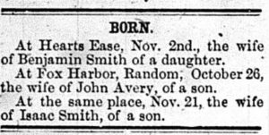 At Hearts Ease, Nov. 2nd., the wife of Benjamin Smith of a daughter.
