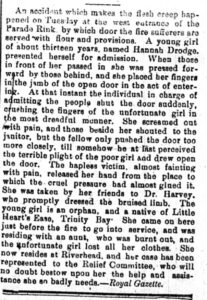 An accident which makes the flesh creep happened on Tuesday at the west entrance of the Parade Rink by which door the fire sufferers are served with flour and provisions. A young girl of about thirteen years, named Hannah Drodge, presented herself for admission. When those in front of her passed in she was pressed forward by those behind, and she placed her fingers in the jamb of the open door in the act of entering. At that instant the individual in charge of admitting the people shut the door suddenly, crushing the fingers of the unfortunate girl in the most dreadful manner. She screamed out with pain, and those beside her shouted to the janitor, but the fellow only pushed the door too more closely, till somehow he at last perceived the terrible plight of the poor girl and drew open the door. The hapless victim, almost fainting with pain, released her hand from the place to which the cruel pressure had almost glued it. She was taken by her friends to Dr. Harvey, who promptly dressed the bruised limb. The young girl is an orphan, and a native of Little Heart’s Ease, Trinity Bay. She came on here just before the fire to go into service, and was residing with an aunt, who was burnt out, and the unfortunate girl lost all her clothes. She now resides at Riverhead, and her case has been represented to the Relief Committee, who will no doubt bestow upon her the help and assistance she so badly needs. – Royal Gazette.