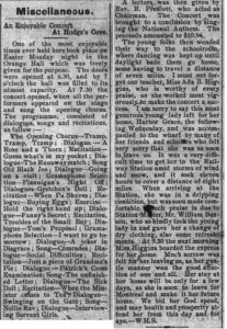 The Opening Chorus – Tramp, Tramp, Tramp; Dialogue – A Rose and a Thorn; Recitation – Guess what’s in my pocket; Dialogue – The Runaway match; Song Old Black Joe; Dialogue – Going on a visit; Gramaphone Selection- Flannigan’s Night Off; Dialogues – Gretchen’s Doll; Recitation – When Pa Shaves; Dialogue – Buying Eggs; Exercise – Hold the right hand up; Dialogue – Fanny’s Secret; Recitation, Troubles of the Small Boy; Dialogue – Tom’s Proposal; Gramaphone Selection – I want to go tomorrow; Dialogue – A joker in Disgrace; Song – Comrades; Dialogue – Social Difficulties; Recitation – Just a piece of Grandma’s Pie; Dialogue – Patrick’s Cross Examination; Song – The Unfinished Letter; Dialogue – The Sick Doll; Recitation – When the Minister comes to Tea; Dialogue- Swinging on the Gate; Song – Nellie Rav; Dialogue – Interviewing Servant Girls.