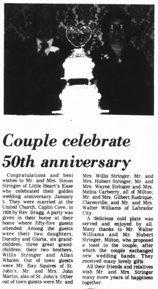 Congratulations and best wishes to Mr. and Mrs. Simon Stringer of Little Heart’s Ease who celebrated their golden wedding anniversary January 5. They were married at the United Church, Caplin Cove, in 1928 by Rev. Bragg. A party was given in their honor at their home where fifty-five guests attended. Among the guests were their two daughters, Dorothy and Gloria, six grandchildren, three great grandchildren, their two brothers, Willis Stringer and Allan Whalen. Out of town guests were Mr. Ray Squires of St. John’s, Mr. and Mrs. John Martin, also of St. John’s. Other out of town guests were Mr. and Mrs. Willis Stringer, Mr. and Mrs. Hubert Stringer, Mr. and Mrs. Wayne Stringer and Mrs. Melita Carberry, all of Milton: Mr. and Mrs. Gilbert Rodrique, Clarenville, and Mr. and Mrs. Walter Willliams of Labrador City.
