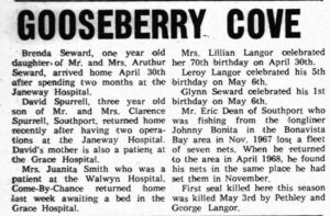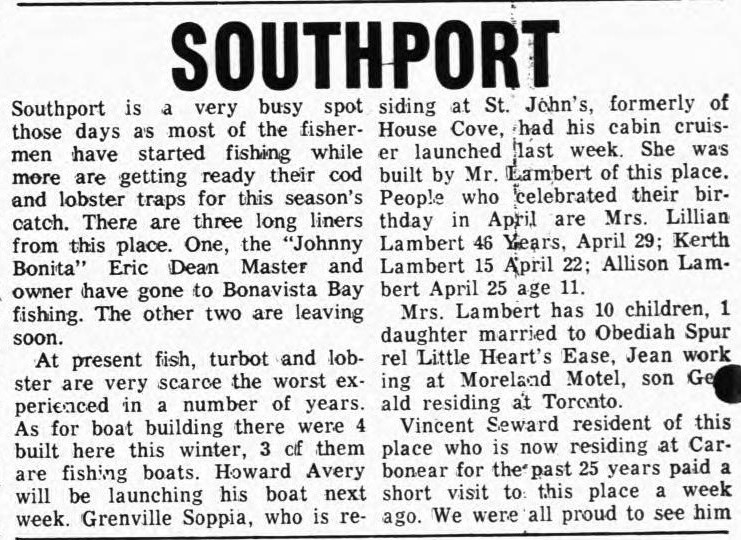 At present fish, turbot and lobster are very scarce the worst experienced in a number of years. As for boat building there were 4 built here this winter, 3 of them are fishing boats. Howard Avery will be launching his boat next week. Grenville Soppia, who is residing at St. John’s, formerly of House Cove, had his cabin cruiser launched last week. She was built by Mr. Lambert of this place. People who celebrated their birthday in April are Mrs. Lillian Lambert 46 years, April 29; Kerth Lambert 15 April 22; Allison Lambert April 25 age 11.
