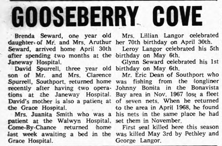 Mrs. George Marsh is improving after receiving treatment in St. Clare’s Hospital. Mrs. Leah Stanford has returned home after spending the winter with her son John in St. John’s.
