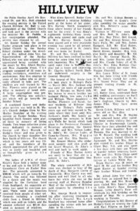 On Palm Sunday April 7th Reverend Dr. and Mrs. Butt attended the evening service in the United Church Hillview. Dr. Butt is superintendent of the United Church and took part in the service with the minister Mr. H. Paddle. A fair congregation attended. The service was enjoyed by all.