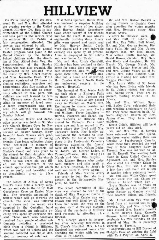 Mr. Alfred John Vey who suffered from an injured foot is improving. Mr. and Mrs. Bruce, Isaacs visited Mrs. Isaac’s parents in Little Heart’s Ease. Kenneth Benson, Little Heart’s Ease will celebrate his 25th birthday on the second of May. He is presently working in Toronto.
