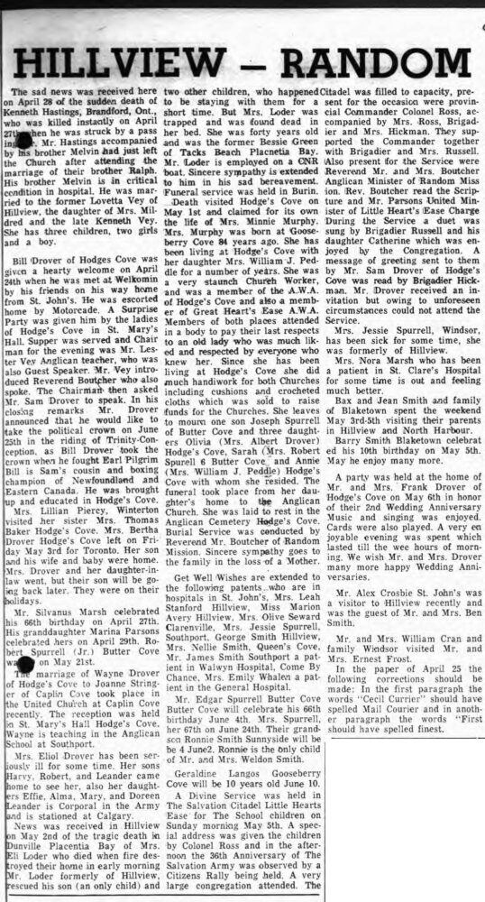 Mrs. Lillian Piercy, Winterton visited her sister Mrs. Thomas Baker Hodge’s Cove. Mrs. Bertha Drover Hodge’s Cove left on Friday May 3rd for Toronto. Her son and his wife and baby were home. Mrs. Drover and her daughter-in-law went, but their son will be going back later. They were on their holidays.