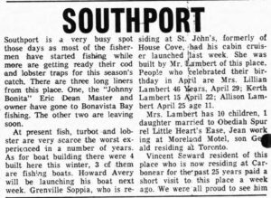 Southport is a very busy spot those days as most of the fishermen have started fishing while more are getting ready their cod and lobster traps for this season’s catch. There are three long liners from this place. One, the “Johnny Bonita” Eric Dean Master and owner have gone to Bonavista Bay fishing. The other two are leaving soon.